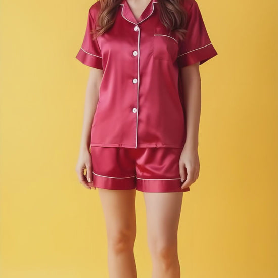 Satin Silk Red Unisex Night Wear Short Pyjama Set
