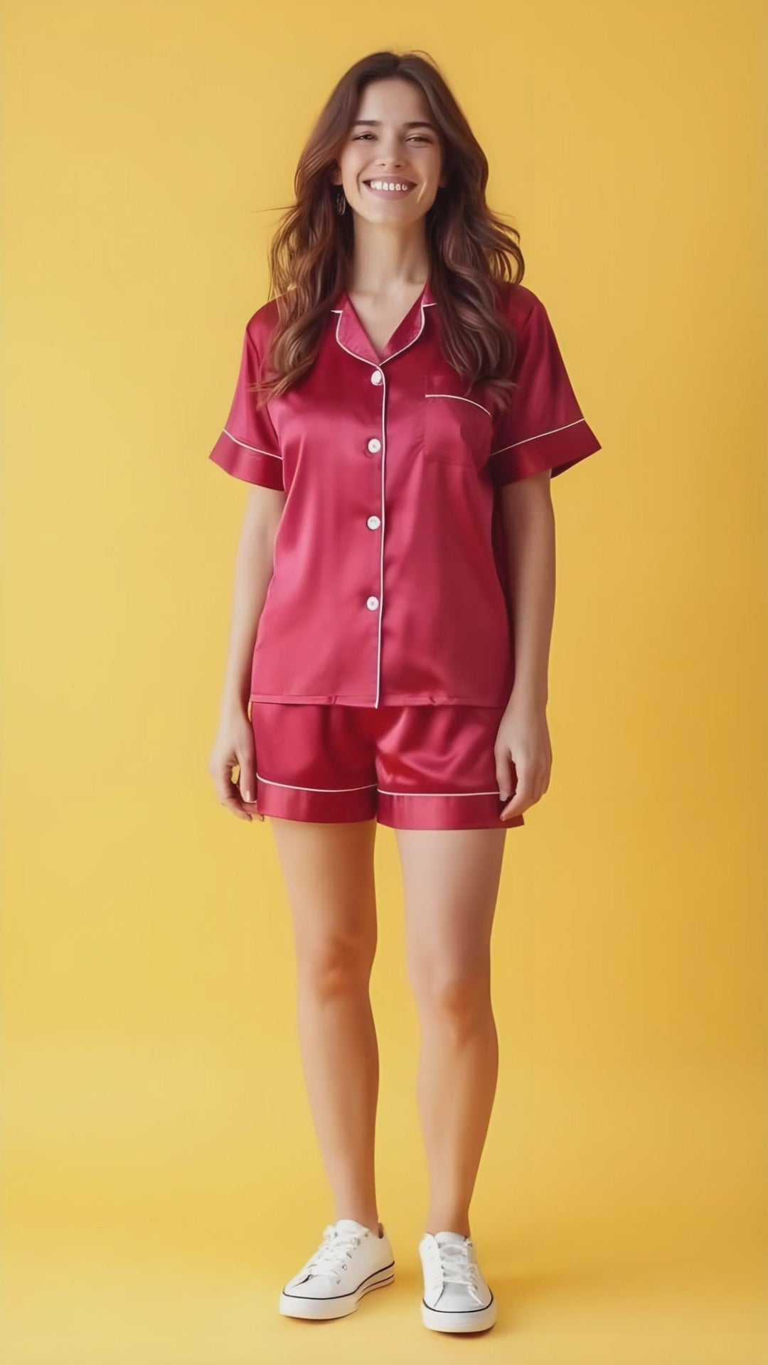 Unwind in style with this luxurious red satin nightwear set, designed for both him and her. Featuring a silky button-down shirt and matching shorts, it offers a smooth, lightweight feel — perfect for cozy, romantic nights in